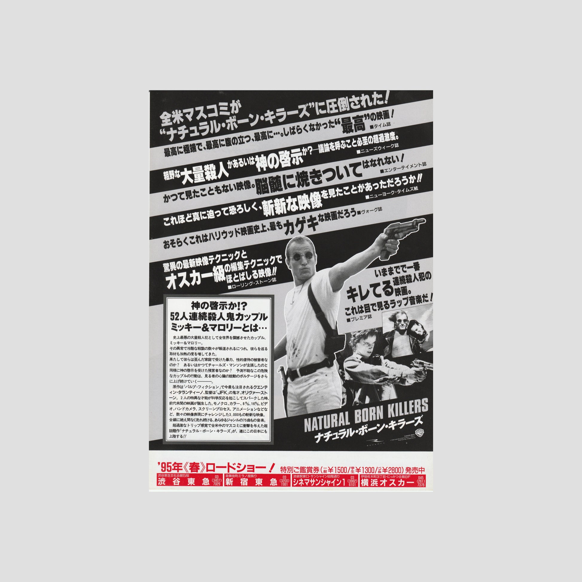 Authentic Japanese movie chirashi poster of Natural Born Killers in B5 size (7 x 10 inches). Imported directly from Japan. Limited supply. Ships from the UK.